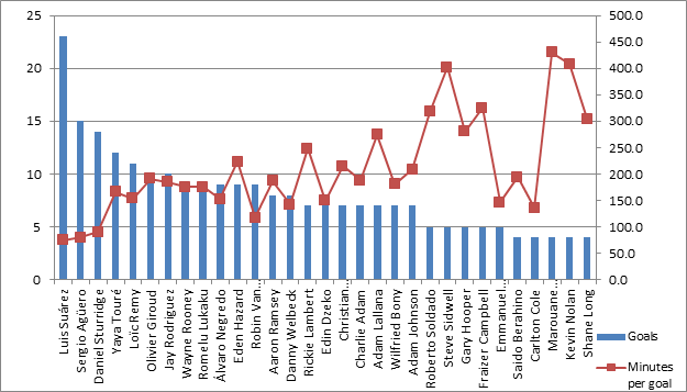 Notice how only 3 players have scored a goal under every 100 minutes they play? No surprises there, given that Luis Suarez, Sergio Aguero and Daniel Sturridge have managed to keep the scorers busy through the season. The advantage of using minutes per goal as a metric to assess goal-scorers is that it removes the effect of time spent on the pitch, or so you would think. While it does not make any considerable difference among the Top 3, it does bring in a sense of perspective as you move from left to right. For example, even though Emmanuel Adebayor has scored only 5 goals, he scores a goal every 146 minutes. Compare this with Rickie Lambert who has scored 7 goals, though scoring a goal every 248 minutes.