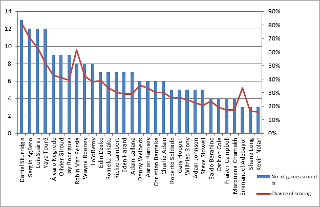 Now the stats start getting interesting. You can clearly see that Daniel Sturridge has scored in 13 matches. Considering he has played only in 16 matches this season, that’s a chance conversion ratio of 81%. Similarly, Sergio Aguero scores in over 70% of the matches he plays in, while Luis Suarez has a ratio of just over 60%. It is interesting to note that Robin van Persie scores in more than 3 out of 5 games he plays in, which goes on to show the importance of the forward in the Manchester United set up.