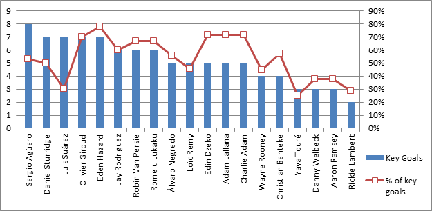 Hence, a key goal could be the first goal of the match, a goal which forces a draw or a goal which breaks a draw at any point in the game. It is not a perfect measure, because for a team trailing by 2 goals, each of the comeback goals is equally important. For sake of simplicity, we assume the above condition though. Hence, Sturridge’s first goal against Aston Villa does not count as a key goal, in this article. Also, for the remaining part of the article, we are considering only players who have scored in at least 6 matches.