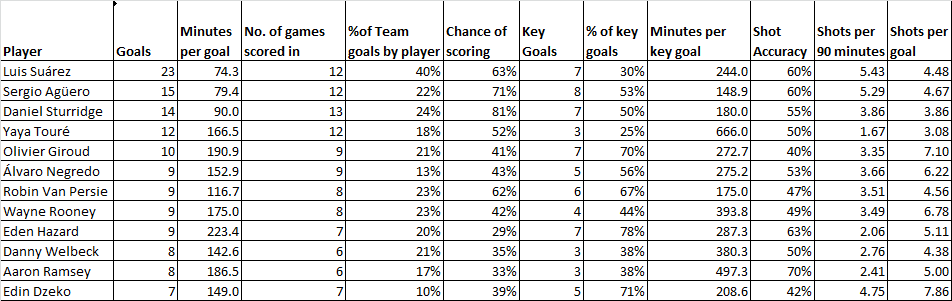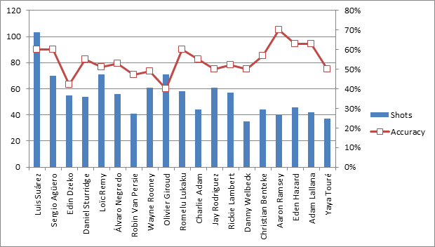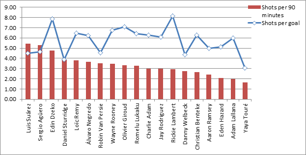 Nothing really springs out from this graph except Luis Suarez’ high number of shots – 103 shots, which is a good 42 shots more than the next player, and Olivier Giroud’s extremely average shot accuracy of 40%. Aaron Ramsey does well to get more than 70% of his shots on target, a good figure for a midfielder. This is not a very good stat to judge a goal scorer by, hence we need to look at something more conclusive.