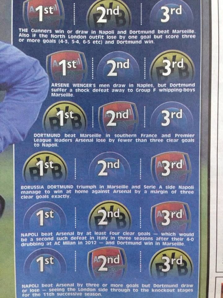 Instead of facing the likes of Real Madrid or Bayern right off the bat, we might draw Olympiakos or FC Basel. That’s not something to turn one’s nose up at. Yes, we very nearly upended Bayern last year and have shown that we can beat almost anyone on our day, but there’s little wrong with looking for a favorable draw.However, should we fall to Napoli, things get a little more interesting. Rule 7.06b of the UEFA Champions League Regulations stipulates that “superior goal difference from the group matches played among the teams in question” if two or more teams are equal on points.At the moment, we have a +2 goal-differential against Dortmund and Napoli. Dortmund is +1. Napoli is -3. Here, then, are a few scenarios (assuming Dortmund defeats Marseille):