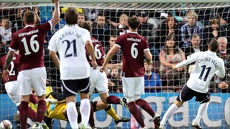 Yesterday I honestly expected that with a partisan crowd behind them and an unprepared and most likely disinterested Spurs facing them, Hearts would have the upper hand. Given Redknapp’s pathetic grievances over the Europa League I couldn’t see him even bothering to send out a decent team. Luckily I got all those predictions wrong. Spurs, for the opening thirty minutes, were exhilarating. It was a pleasure to watch. This is the way a Tottenham team should play. We invented the pass and move game in England, its our trademark and when Tottenham are in full flow , no one does it better. We were three up inside the opening half hour, with superb strikes from Rafa, JD and then Livermore with a great one two. The latter pleased me no end as Jake is a local lad, and its always good to see players with the club truly in their hearts prosper, especially when compared to a certain mercenary Croatian chasing the plastic. At the start of the second half Hearts gave a bit more of a performance and a few scares from corners until a great ball from Huddlestone set Bale free for an easy finish. Any nerves were then settled and a beautifully worked goal on the counter attack with Azza providing the finishing touch capped a good night’s work and setting next week’s second leg at the Lane up as what should be a formality . Mind you I’m Spurs and being Spurs means being a pessimist and if any football team anywhere in the world could find a way of throwing away a five goal first leg lead at home, its Spurs. A special mention for Nico, a player so criminally underused by Redknapp last season….he was superb in the centre of midfield, lets hope we don’t let him go and he gets more playing time this season.