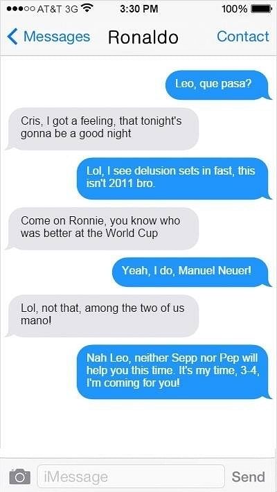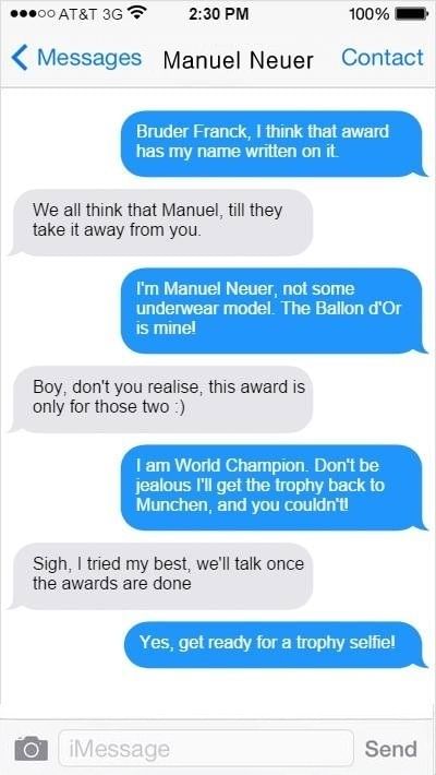 Manuel Neuer wasn’t definitely fooling around when he had said that he thought he deserved the Ballon d’Or. The man is deluded more than that Liverpool fan who has been thinking all these years that they can win the league. Here is his conversation with Bayern Munich teammate Franck Ribery that Pedro had managed to hack into.