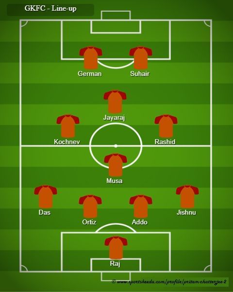 Gokulam Kerala FC (4-1-3-2): Raj (GK), Jishnu, Addo, Ortiz, Das, Musa, Rashid, Jayaraj, Kochnev, Suhair, German