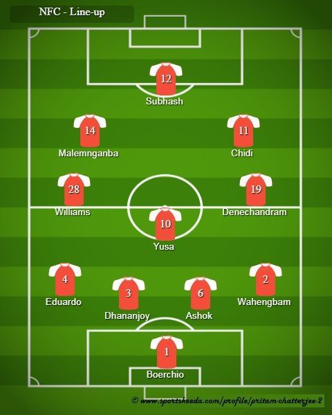 NEROCA FC (4-3-3): Boerchio (GK), Eduardo, Dhananjoy, Ashok, Wahengbam, Williams, Yusa, Denechandram, Malemnganba, Subhash, Chidi