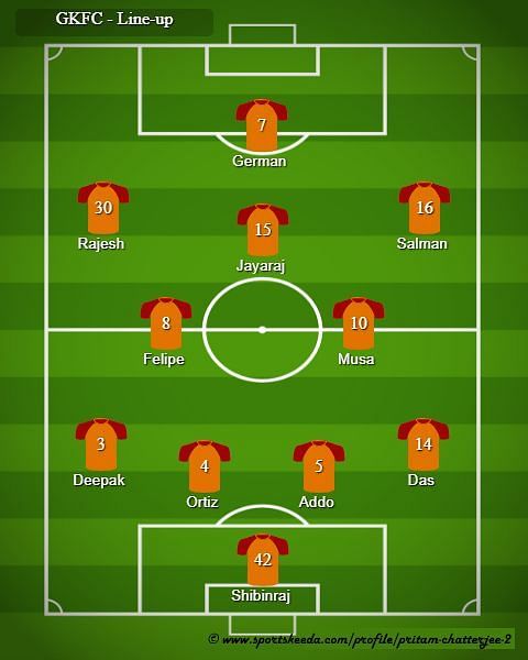 Gokulam Kerala FC (4-2-3-1): Shibinraj (GK), Deepak, Ortiz, Addo, Das, Felipe, Musa, Rajesh, Jayaraj, Salman, German