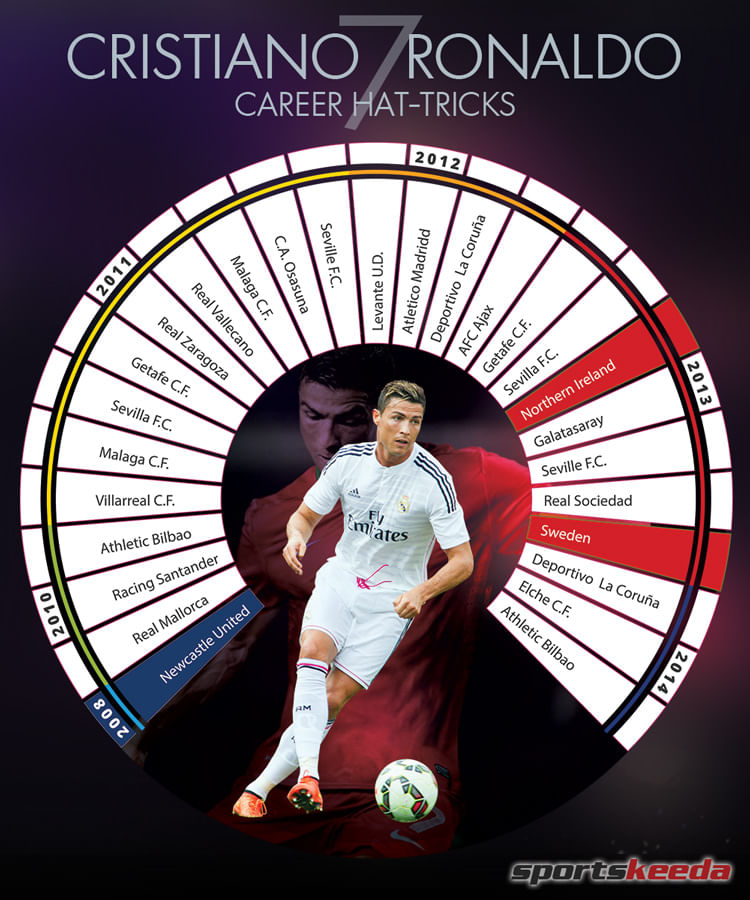 With Real Madrid, he has grabbed a hat-trick in La Liga games an astonishing 22 times – equalling Telmo Zarra and Alfredo Di Stefano with 2 other hat-tricks coming in the UEFA Champions League, two in international football and one for his former club Manchester United.