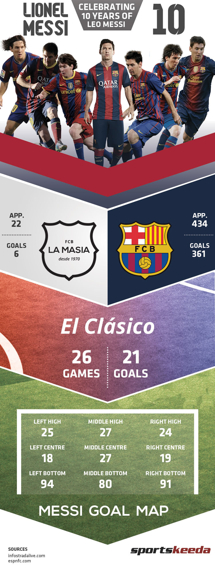 Ten years ago, on this day (16 October 2004), a 17-year-old Lionel Messi stepped on to the pitch for Barcelona in a La Liga game against Espanyol. Back then, he had the number 30 on his shirt. Signed by Barcelona at the tender age of 11, Messi would go on to inherit the no.10 shirt and break a number of goalscoring records. Ten years and countless individual awards and club trophies later, we take a look back at some astonishing numbers of the little Argentine magician.