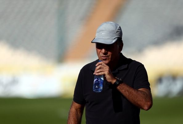 Iran’s national team’s Portuguese coach Carlos Queiroz drinks water during their last training session in Tehran.
