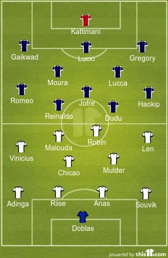 Delhi Dynamos XI: Doblas; Adinga, Anas, Riise, Souvik; Mulder, Chicao, Malouda, Len, Vinicius, Robin