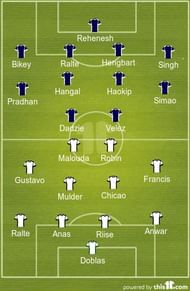 Delhi Dynamos XI: Doblas, Riise, Anas, Anwar, Ralte, Mulder, Malouda, Dos Santos, Chicao, Robin, Francis