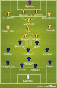 Kerala Blasters (4-1-3-2): Bywater, CK Vineeth, Williams, Rahul Bheke, Sandesh Jhingan, Ramage, Josu Currias, Carlos Marchena, Cavin Lobo, Mohammad Rafi, Chris Dagnall