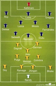 FC Goa (3-4-3): Laxmikant Kattimani, Gregory Arnolin, Lucio, Debabrata Roy, Mandar Desai, Leo Moura Jonatan Lucca, Victorino Fernandes, C.S Sabeeth, Reinaldo, Dudu Omagbemi