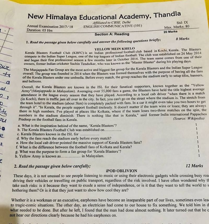 The comprehension passage that surely came as a surprise and probably a sense of relief for its students, included an insight into the fan base of the Kerala Blasters and the scenario of the team's home ground when they set out to play.