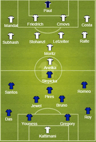 FC Goa (4-2-3-1): Kattimani; Debrata Das, Youness Bengelloun, Gregory Arnolin, Narayan Das; Bruno Pinheiro, Robert Pires, Andre Santos, Jewel Raja, Romeo Fernandes; Miroslav Slepicka