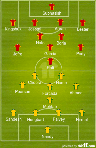 Kerala Blasters (4-1-3-2): Sandip Nandy, Nirmal Chhetri, Colin Falvey, Cedric Hengbart, Sandesh Jhinghan, Mehtab Hossain, Ishfaq Ahmed, Forcada, Stephen Pearson, Iain Hume, Michael Chopra