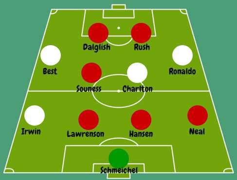 Cristiano Ronaldo, George Best are on the wings while Anfield duo Kenny Dalglish and Ian Rush are united up front in this formidable looking team.