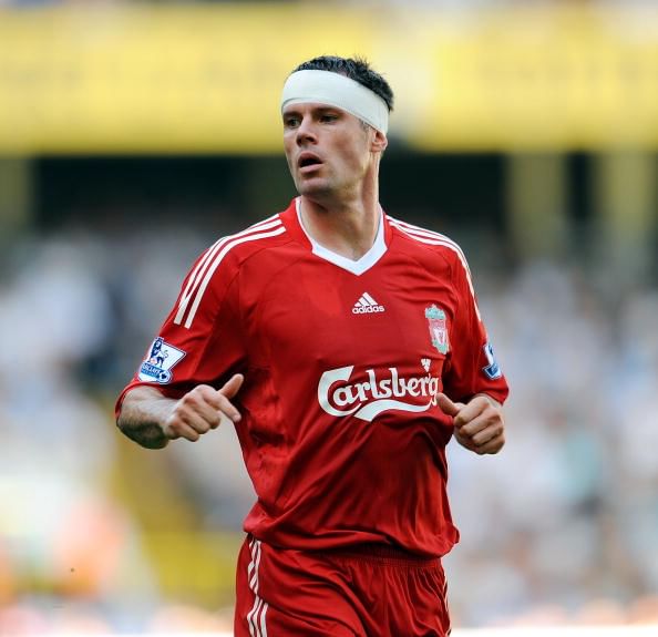 LONDON, ENGLAND – AUGUST 16: (THE SUN OUT) Jamie Carragher of Liverpool wears a bandage around his head after clashing heads with teammate Martin Skrtel whilst going up for a header during the Barclays Premier league match between Tottenham Hotspur and Liverpool at White Hart Lane on August 16, 2009 in London, England.
