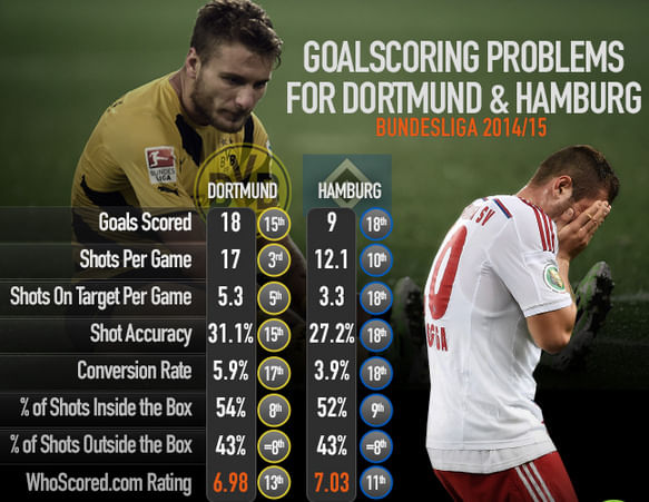 It’s been even worse for Hamburg, the lowest scorers with a meagre 9. Their shot count of 12.1 per match is by no means disastrous (putting them 10th in the rankings). No team, however, hits the target with less – just 3.3 per game to date. Only 4 goals have been scored from open play so far.The struggles of major signing Pierre-Michel Lasogga have been a major problem; he scored 13 in 18 starts while on loan from Hertha Berlin last season, plus the play-off strike at Greuther Fürth which kept the club up, but he has just 2 in 16 (15 starts). His shot-per game count is down from 13/14’s 3.6 to 2.9.