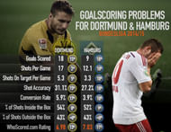So myriad have been Dortmund’s failings in the opening segment of the campaign that it’s sometimes been hard to focus on what their biggest problem is. Let’s cut to the chase – it’s goalscoring. Only three teams have posted less than the 18 in 17 matches that Jürgen Klopp’s side have registered, a staggeringly low amount for a side with such a plethora of attacking talent at its disposal, even after the departure of Lewandowski. Pierre-Emerick Aubameyang is their Bundesliga top scorer with a modest 5, while expensive summer signings Adrián Ramos and Ciro Immobile have just 5 more between them.It’s not as if they’re not creating anything. Only two teams have more shots per game than Dortmund’s 17; Bayern, of course (18.9), and Roger Schmidt’s dynamic Bayer Leverkusen (17.9). It’s notable, however, that 43% of these come from outside the box, underlining their difficulty in opening teams up – Aubameyang’s pace, in the absence of the injured Marco Reus’ craft, has been the main conduit to do so, with three assists. Maybe new arrival Kevin Kampl (the Europa League’s second-highest assist provider with 4, and 3.7 key passes per game for Salzburg) can help.