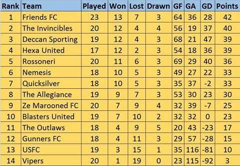 Friends FC powered by Froogal.in continued to top the table in the second running week, with other teams pushing up closely for the title challenge. With games in hand Hexa United, Deccan Sporting, The Invincibles, and Rossoneri are eyeing the cherished prize, but only time will reveal who will come out on top.This is how the table stands after the action from week 5.