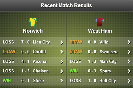 Both clubs are in the midst of a scoring crisis, as Norwich have failed to hit the back of the net in three straight in all competitions, whilst West Ham are without a goal in two Premier League contests on the bounce.
