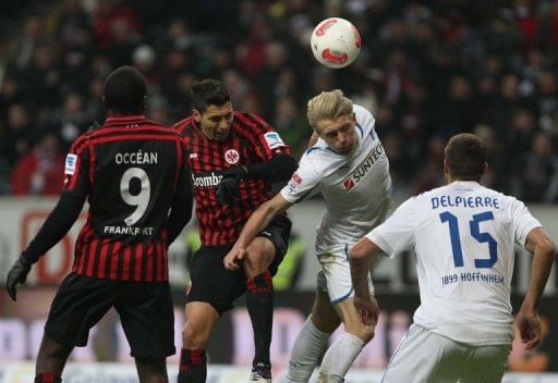 L-R: Frankfurt’s forward Olivier Occean and midfielder Karim Matmour fight for the ball with Hoffenheim’s defenders Andreas Beck and Matthieu Delpierre during a German first division Bundesliga football match in Frankfurt am Main, western Germany, on January 26, 2013. Eintracht Frankfurt stayed in the chasing pack with a 2-1 home win over Hoffenheim.