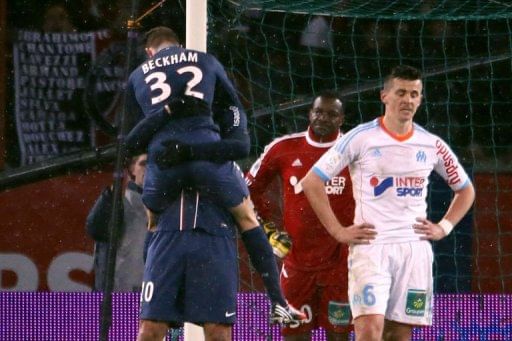 Paris Saint-Germain’s English midfielder David Beckham (R) vies with Marseille’s French midfielder Andre Pierre Gignac during the French L1 football match Paris Saint-Germain (PSG) vs Olympique de Marseille (OM) on February 24, 2013 at the Parc des Princes stadium in Paris.