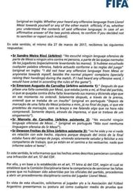 While reviewing the match, FIFA requested the officials to provide any details as to whether they heard offensive language from Lionel Messi towards themselves or any of the match officials. Sandro Meira Ricci, the match official, reiterated the fact that he had not heard any verbal abuses from Messi towards himself and if he had, he would have taken action.