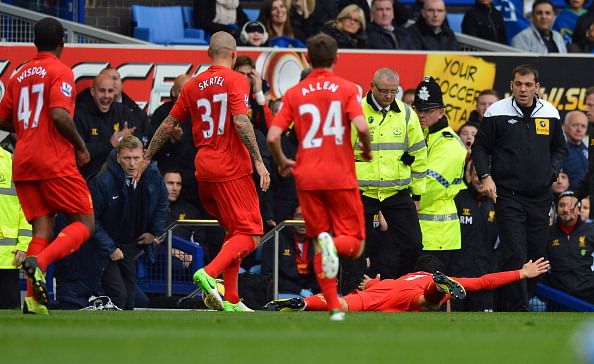 It was evident that Rodgers’ system allowed Suarez to express himself in a way that he wasn’t able to under Dalglish. His role expanded from being a goal-poacher to the lone-striker who drops into the midfield to create and score goals. He was running the channels with greater mobility, was more clinical and added a deadly dead ball ability to his game that had remained under covers before. Suarez scored 30 goals in all competitions under Rodgers missing out to Gareth Bale for the player of the season award but that could have turned out very differently if not for “the bite”. It’s difficult to see how he anyone can stop him from grabbing that accolade this season.4. The Diving Celebration