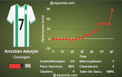 On his way to collecting a performance score of 107, Adorjan’s most impressive performance came in his side’s 4-1 victory over RKC. A man of the match performance, including one goal, saw him score a performance rating of 86. He scored once from four attempts, and made an impressive 86% of his passes