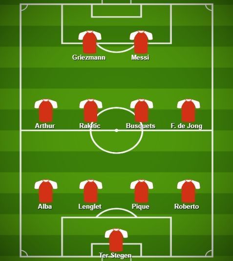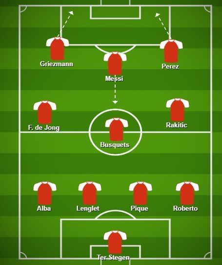 With Messi playing as False 9, Griezmann could return to the left flank whereas Perez can be placed at the right. The midfield could consist of Frenkie de Jong, Sergio Busquets and Rakitic until Arthur returns from injury. The continuous link that Messi would create between the midfield and attacking third is bound to leave the opposition defenders fretting.
