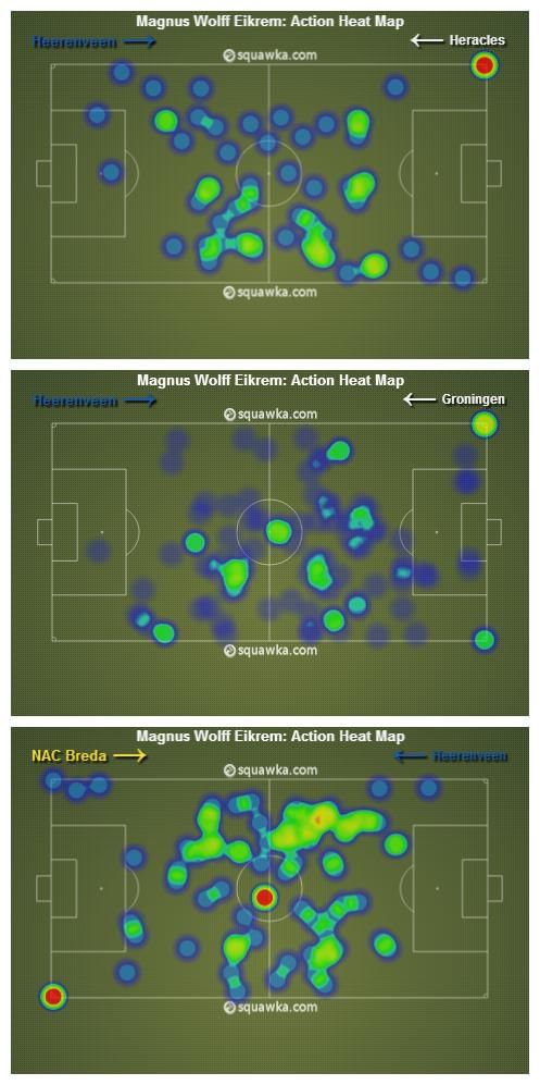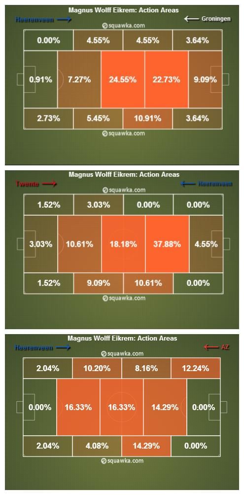 Notice how against Groningen he was more involved in the final third while against the league leaders, Twente, he was involved in deeper areas. Lastly, against AZ is his usual position, venturing forward when needed and staying deeper to breakdown the attacks.