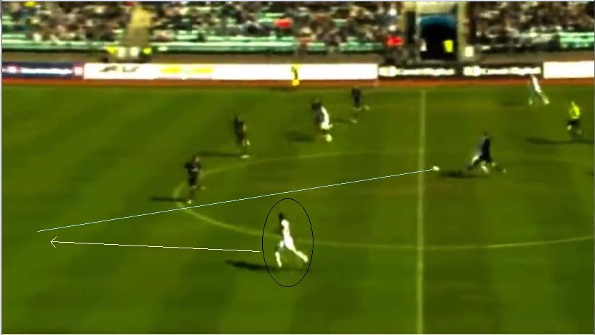 Quite visible in the image is how behind Eikrem (circled) is to the defender, but thanks to the pace he possesses and his gifted body balance, he outpaces him to reach the ball whose direction is shown by the blue line.