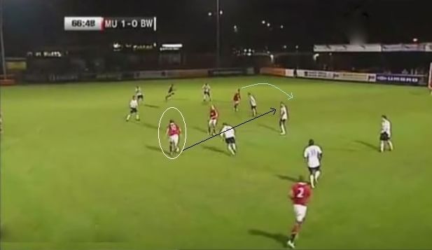 Another positive of Eikrem is that he tries to keep things tidy and does the things in a simple way. You won’t see him attempting unnecessary skills or as some say, showboating. He is also a great set piece taking option, being a regular free kick taker and corner taker for Molde where he scored some beautiful free kicks and made some delicious deliveries from the corner. Physique wise, he isn’t exactly gifted but he uses his lightweight to his advantage by slipping and sliding through a group of players. He combines his quick and silky feet with sudden acceleration to devastating effect. He has good pace, add to it his short height makes it easier him to cover long distance and outpace the defenders. One such example is the following image.