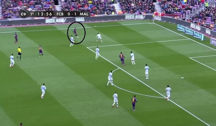 The Barcelona midfield constantly surged into the box and left Busquets with an impossible amount of space to cover when the ball was lost. Below is an example: Iniesta and Rafinha are both in the box, Alba is high up the pitch, as is Alves on the other flank. After a simple math equation, we notice that only Busquets, Piqué and Mathieu are at the back and Málaga easily escapes to start a counter.