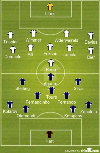 Tottenham Hotspur (4-5-1): Lloris; Trippier, Wimmer, Alderweireld, Davies; Dembele, Dier; Alli, Eriksen, Lamela; Kane