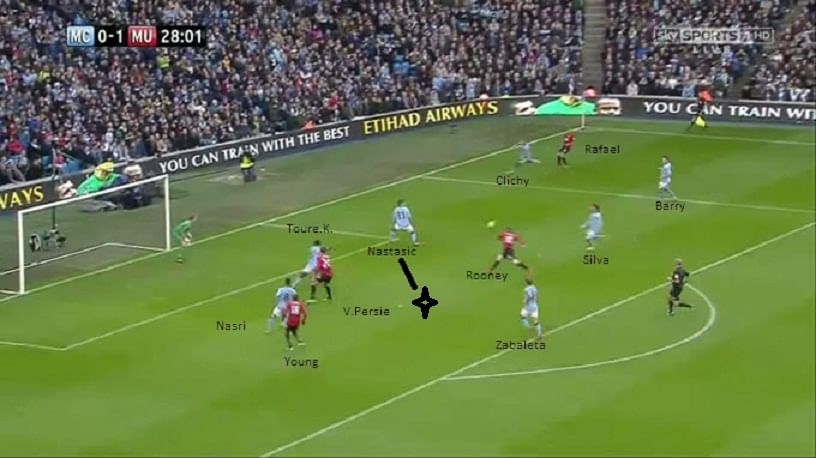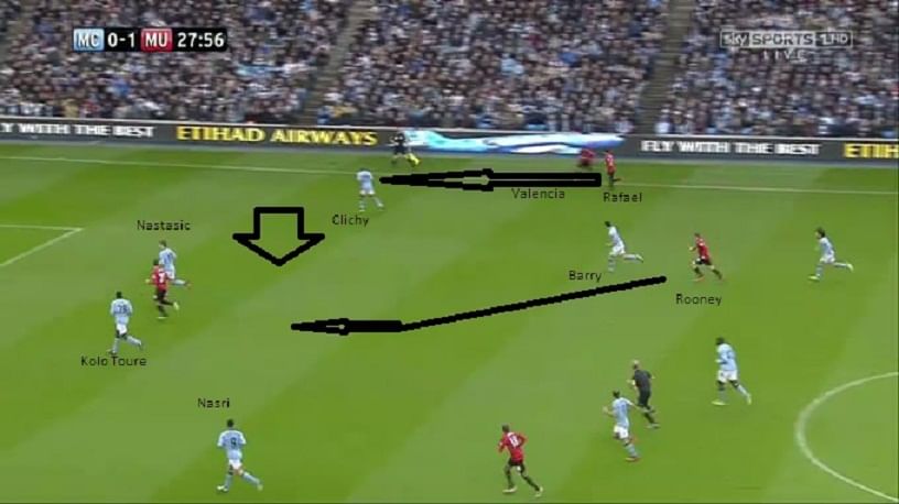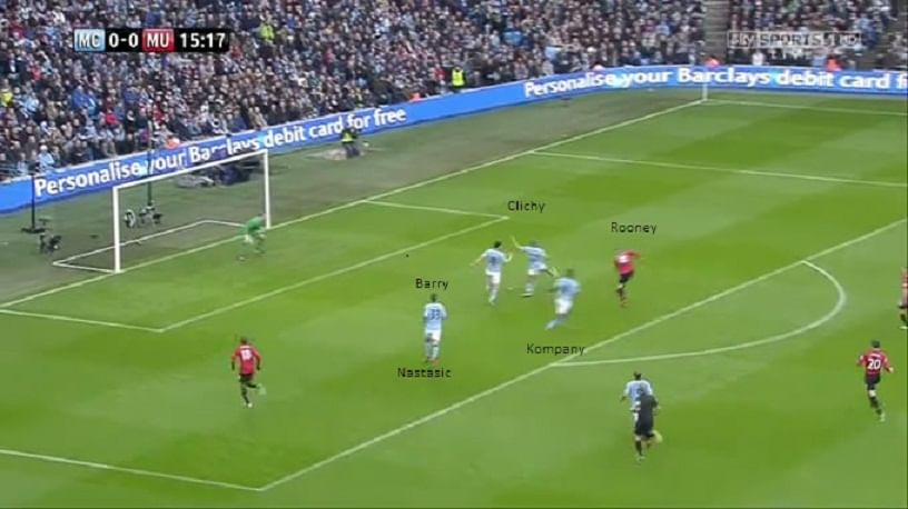 Rooney’s first goal came from a Manchester United counter attack, as City’s defensive line was caught unawares after an Aguero attack. Here, Ashley Young cleverly runs past Zabaleta, who is unable to match him for pace and so too Kompany. We can also see that Barry, who is supposed to be marking Rooney, is a good yard away from him, and Nastasic is completely left alone without the aid of his fellow defenders. Gael Clichy too can be seen making his way towards Rooney.