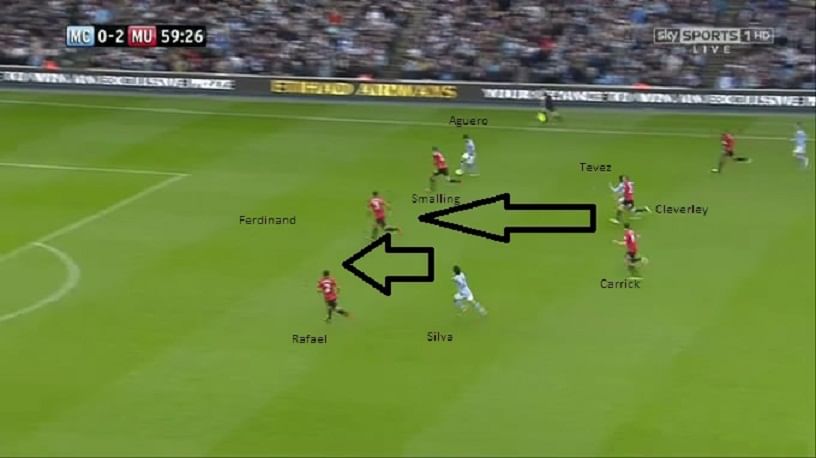 Aware of United’s defensive problems, Carlos Tevez was introduced later on. His impact on the pitch was instant. The energy he brought to the team was spontaneous. Here, City go on the break as Cleverley tries to recover, but Tevez has too much pace for him, which opens up the option of David Silva, unmarked by Rafael, a problem Ferguson has faced throughout this season.