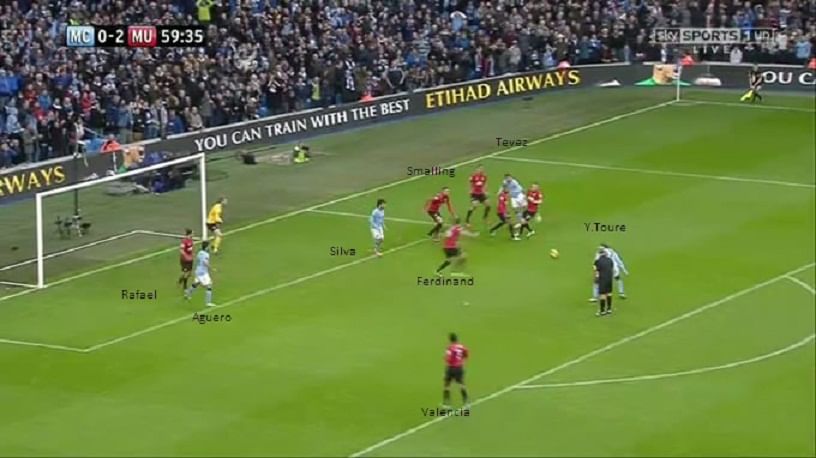 In the above snapshot, it is evident that Silva is offside, and Tevez uses his strength to get up to the ball to bring it down for Yaya Toure, who now has a clear shot at goal. Ferdinand too has himself in a tangle, as does Smalling.