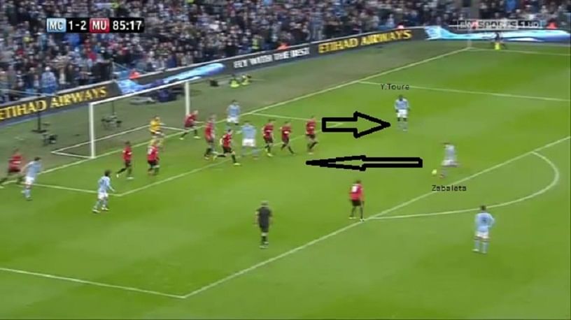 After being handed the captaincy upon the departure of captain Vincent Kompany, Zabaleta led by example, as City pulled back 2 goals to draw level. Here, we see the typical United defence this year, as Zabaleta is not marked and neither is Yaya Toure. It goes on to illustrate how bad United have been at the back, and they will have to tighten their screws if they are to compete with the best in Europe.