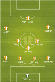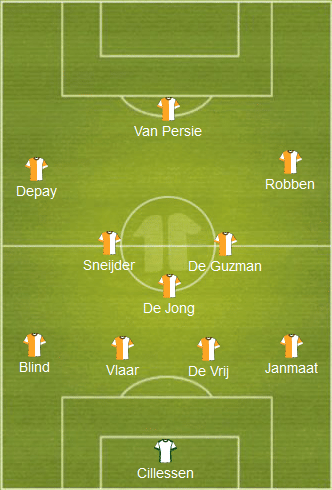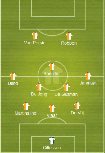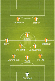 In the penalty shootout victory against Cost Rica, the Dutch finished the match with a 4-4-2 formation as the centreback Bruno Martins Indi was replaced by Huntelaar in extra time to support Robin van Persie up front.