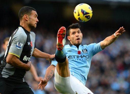 Manchester City‘s Sergio Aguero (R) and Tottenham Hotspur‘s Steven Caulker during their Premier League match on November 11. City beat Tottenham 2-1 to maintain pressure on early-season leaders Manchester United.