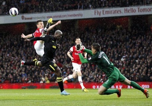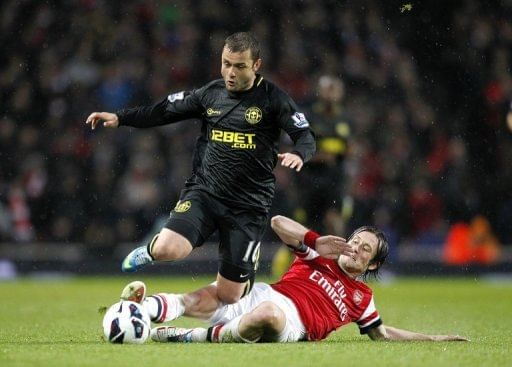 Arsenal midfielder Tomas Rosicky (R) challenges Wigan’s Shaun Maloney during their Premier League match on May 14, 2013. Maloney’s superb free-kick in first half stoppage-time had given Wigan hope after Lukas Podolski’s early opener.
