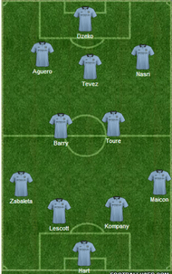 Nasri, Tevez and Aguero are more likely to be the players playing behind the lone striker Dzeko. Silva is doubtful for the clash with a hamstring injury, otherwise he would have replaced Nasri in the starting line–up. Nasri and Aguero would work the flanks with Aguero taking up goalscoring positions in the box as well. Tevez will play off Dzeko, looking to draw one of the central defenders out of position, enabling Aguero to take advantage of the space created. City’s goal – scoring chances depend largely on how these three work together and whether they create enough chances for Dzeko to feed on.