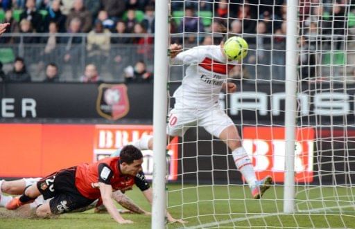 Paris Saint-Germain’s forward Zlatan Ibrahimovic (R) scores a goal during their French L1 football match against Rennes on April 6, 2013 at the Route de Lorient stadium in Rennes, western France. PSG won 2-0.