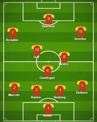 Ozil picked a 4-3-3 formation for his Ultimate FIFA Current World XI containing big names from Real Madrid, Arsenal and the German national side. He placed Manuel Neuer in goal, Marcelo at left back, Sergio Ramos and Jerome Boateng in the centre with Hector Bellerin at right back, making the young Arsenal full-back the only player to represent the Gunners in defence. In midfield, he picked Germany’s Ilkay Gundogan as the holding midfielder and Real Madrid’s Luka Modric to partner himself, thus completing the midfield pyramid. Meanwhile, up front, Ozil chose Cristiano Ronaldo and Karim Benzema, both of whom he played with at the Bernabeu, and finally his current Arsenal teammate, Alexis Sanchez.