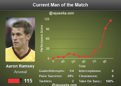 As well as Ramsey’s superb goal, he tested John Ruddy in the Norwich goal four times – peppering him with shots from all around the penalty area. The Welshman also helped in setting up Arsenal’s second goal by playing a quick ball out the defence to allow Arsenal to break forward quickly. Ramsey made five successful take-ons as he drifted past the Norwich players with great ease. The Welshman ended the game with one goal, one assist and five successful take-ons.