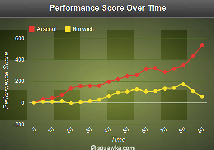 The Performance Score shows exactly how much Arsenal dominated and how Arsenal’s performance got better and Norwich’s got worse over the course of the game. As you can see, the first 15 minutes of the game were very evenly matched; both teams had chances and could have taken the lead. From then onwards it was a one-way game – Arsenal continued to dominate and although when the second-half began, Norwich had a couple of chances, this eventually prevailed and The Gunners took control of the game once more. The last 20 minutes show how Arsenal’s dominance kept getting stronger and stronger – from the 70th to the 90th minute, Arsenal’s Performance Score nearly doubled, Norwich’s Performance Score more than halved, a breathtaking statistic.