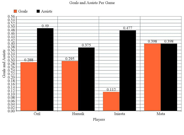 The per game info shows Özil in a slightly better light by making statistics more accurate. Assists and goals are the most important factors when deciding how effective CAMs are, but other factors like chances created, successful through balls, tackles made, interceptions made, dribbles completed, etc. are also noteworthy.